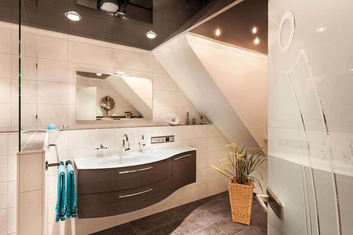 תיאור: נעשה שימוש אופטימלי בתכנית הרצפה המיוחדת ובשיפועי הגג הקיימים ונוצרה תא מקלחת גדול עם מחיצת זכוכית אמיתית. שילוב ריהוט האמבטיה עם יהירות זכוכית מציע שטח אחסון רב.